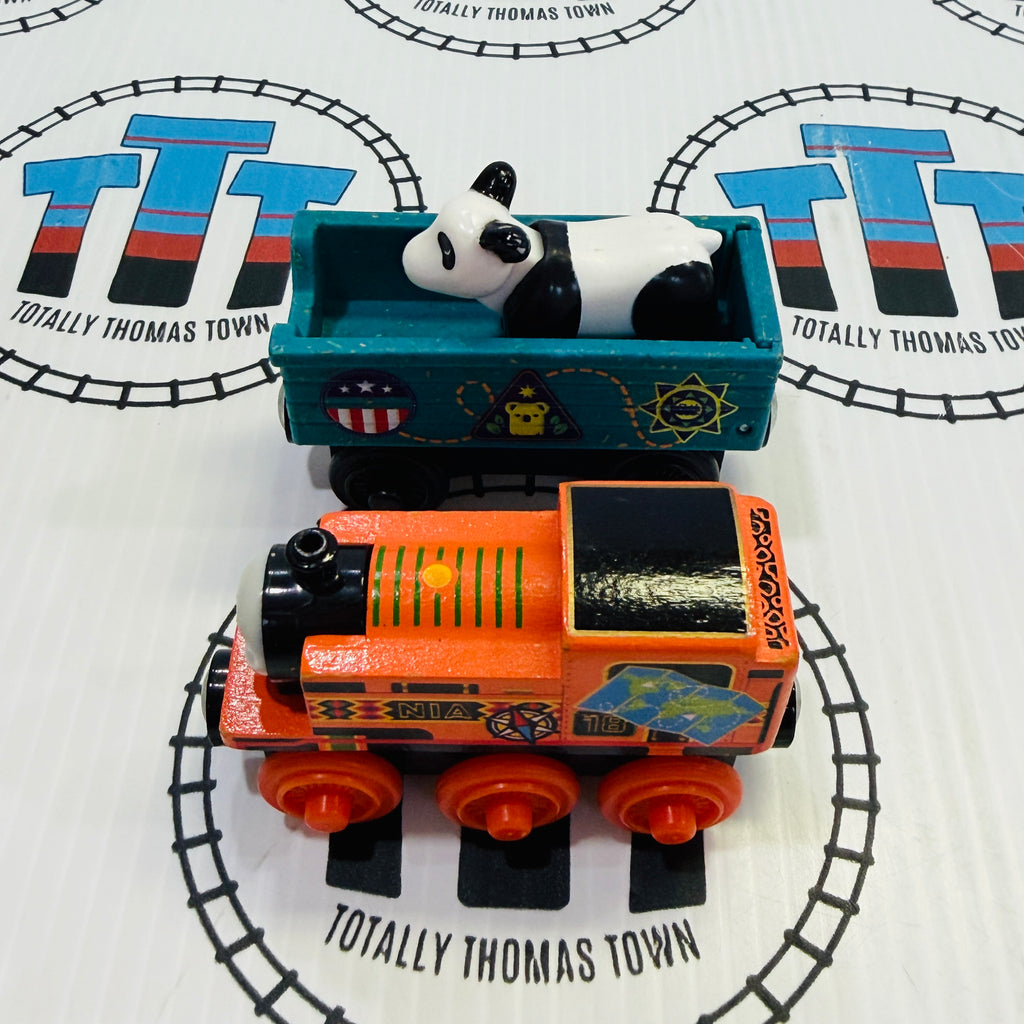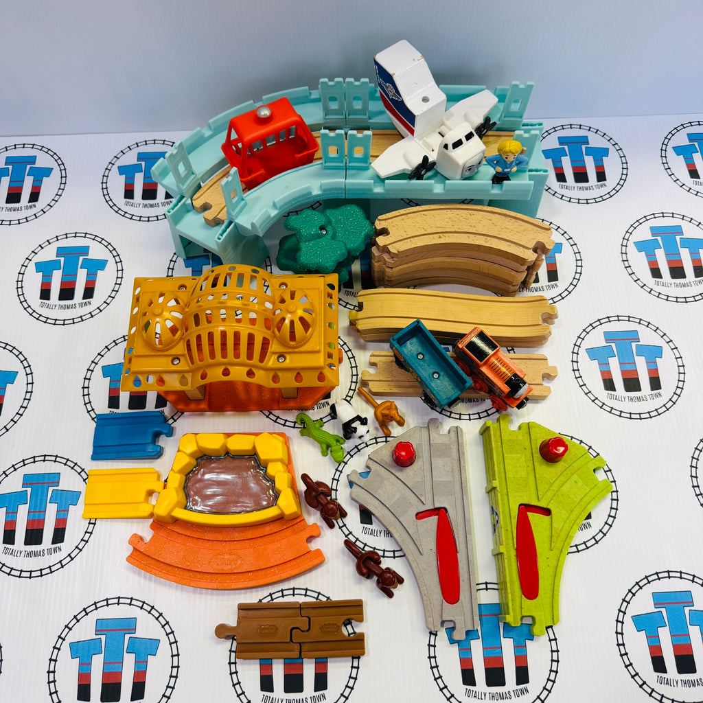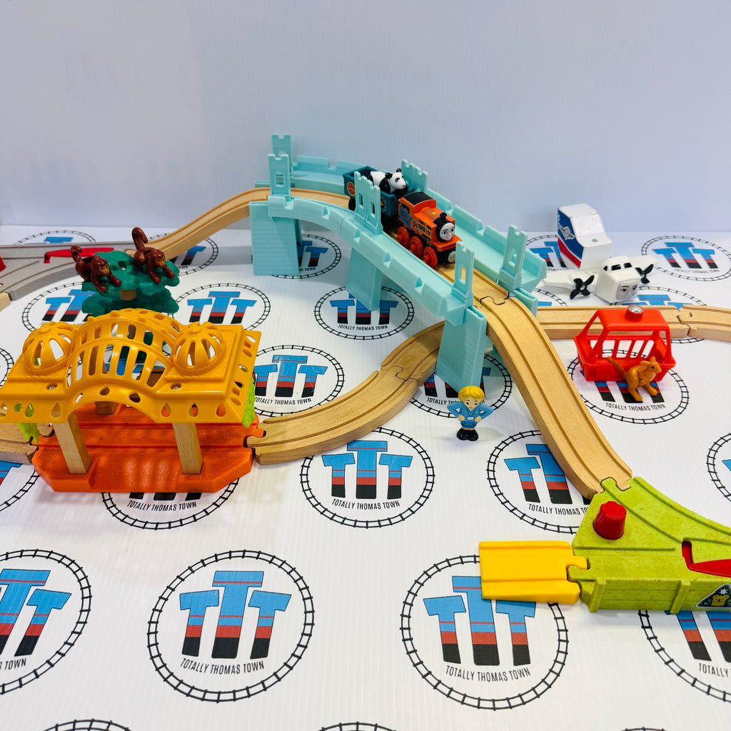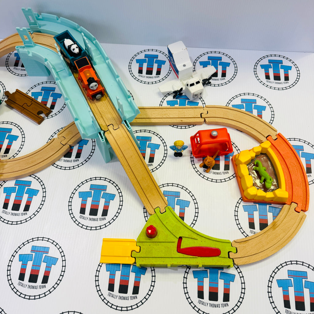 Thomas brand used set as shown, includes adapter for wood to wooden track. Track printing is faded